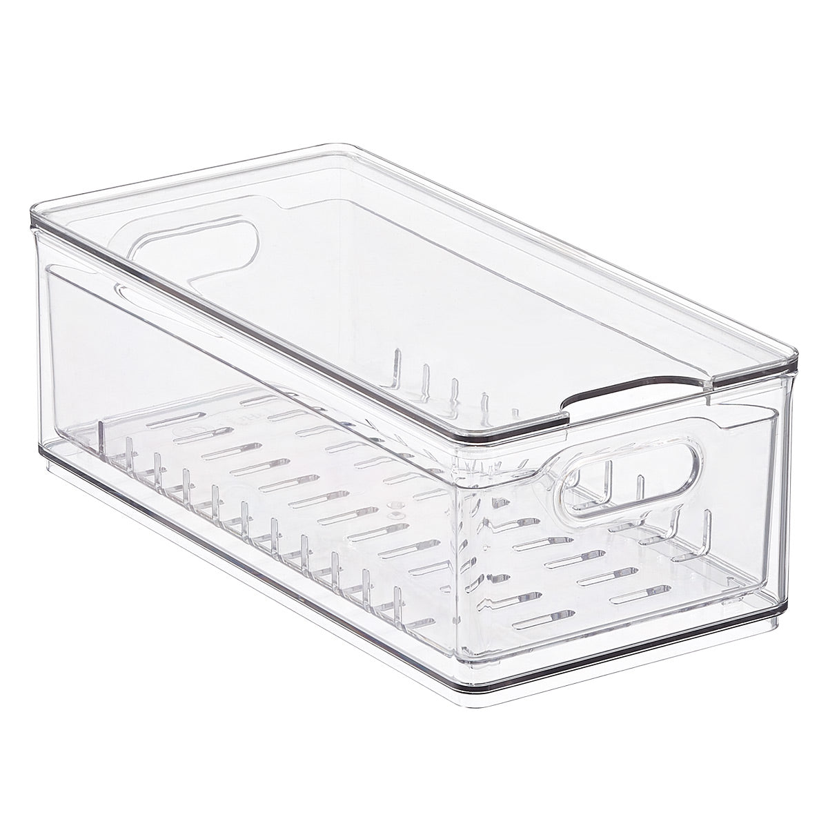 Meet The Home Edit by iDesign Refrigerator Bins, an advanced solution for organized and fresh food storage. These modular organizer bins are crafted to improve your fridge and pantry organization. Each bin features a removable drainage tray to maintain the freshness of your fruits and vegetables by preventing moisture buildup. The innovative colander insert streamlines meal prep with effortless rinsing and straining. With their modular and stackable design, these bins maximize shelf space and ensure clear visibility of your stored items. Constructed from exceptionally durable clear PET plastic, they are suitable for both refrigerator and freezer use. Hand-wash only to ensure long-lasting use.
