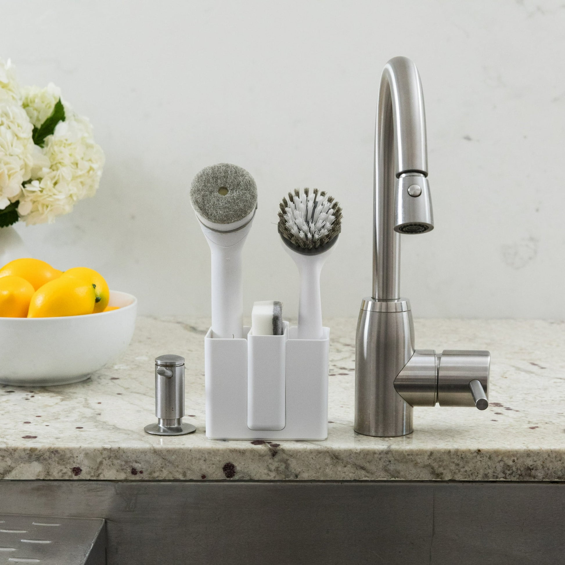 With our Fillable Dish Wand, there's no need to pause your scrubbing when you need more soap. Just press the button, and voila! The scrubber pad is tough enough to get the job done but is gentle enough for non-stick cookware or stainless steel.